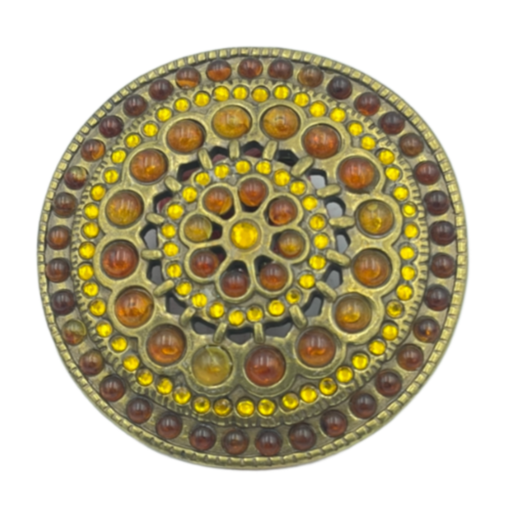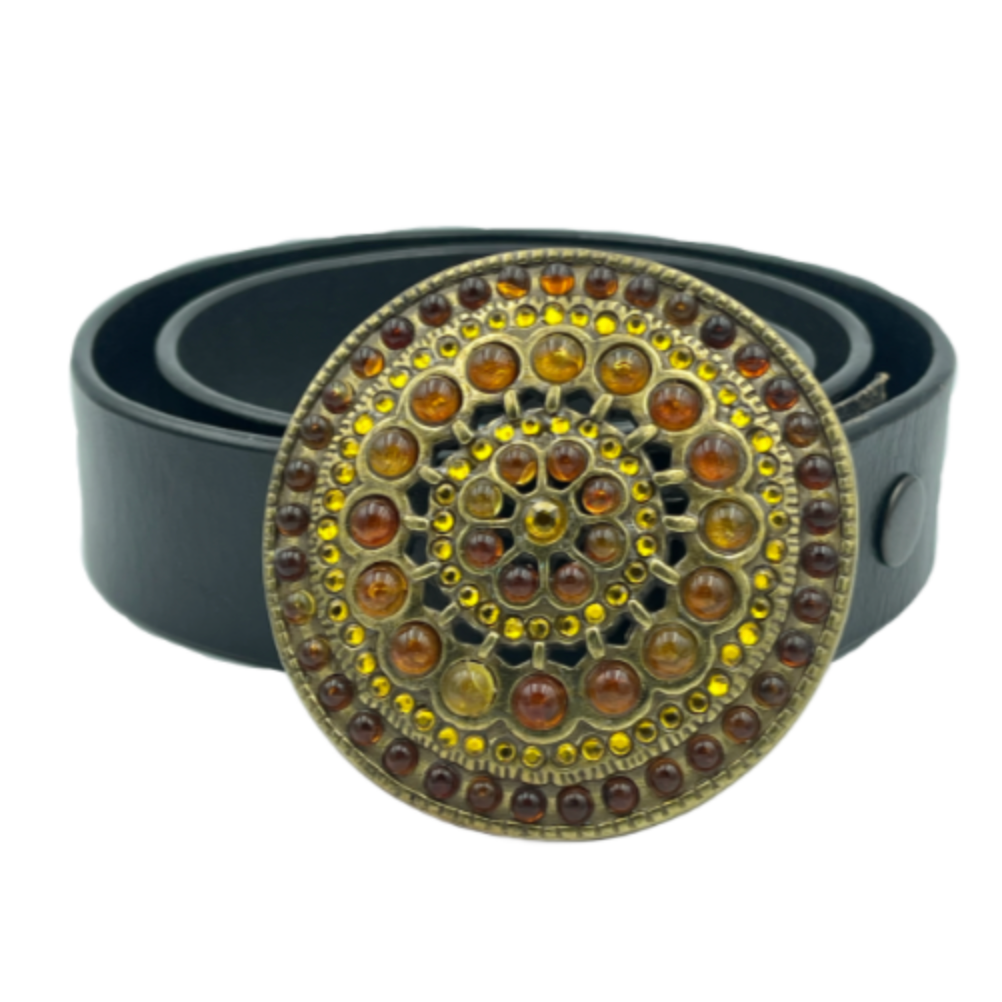 Yellow Maroon Brown Rhinestones Round Floral Belt Buckle