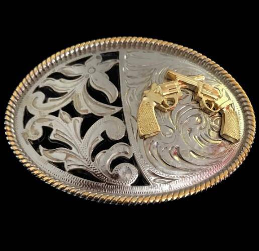 Western Style Cowboy Crossed Gun Shooter Belt Buckle Silver Gold Tone