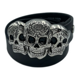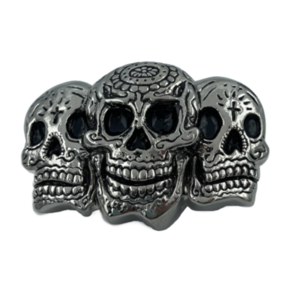 This belt buckle features three menacing skull heads, making it an ideal accessory for a Halloween party. It is part of the Skull Belt Buckle line, designed to add a spooky touch to any outfit.