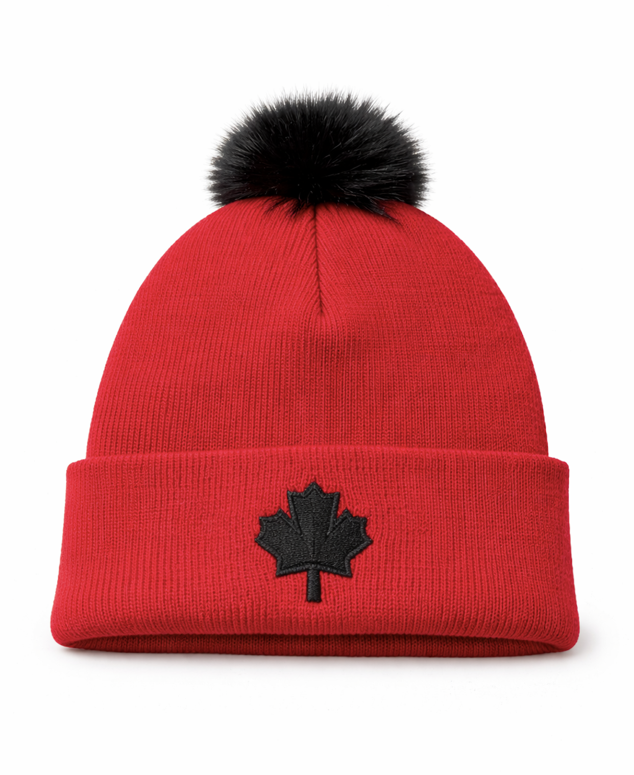 Red Knit Beanie with Pom-Pom – Canada Maple Leaf Winter Hat