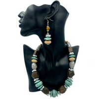 Teal Colored Stone And Wood Beaded Necklace Earrings