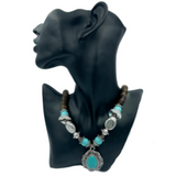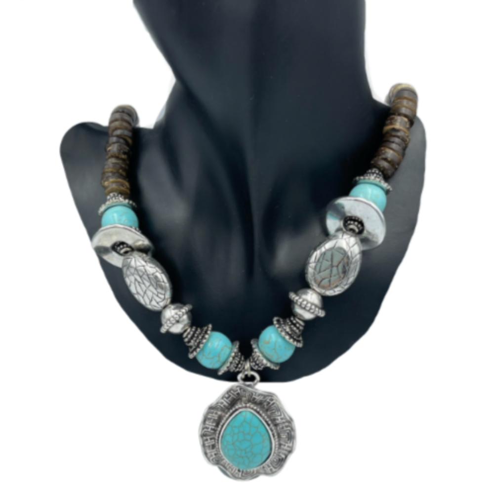 Blue Turquoise Colored Stone Pendant Wooden Beaded Boho Chic Necklace