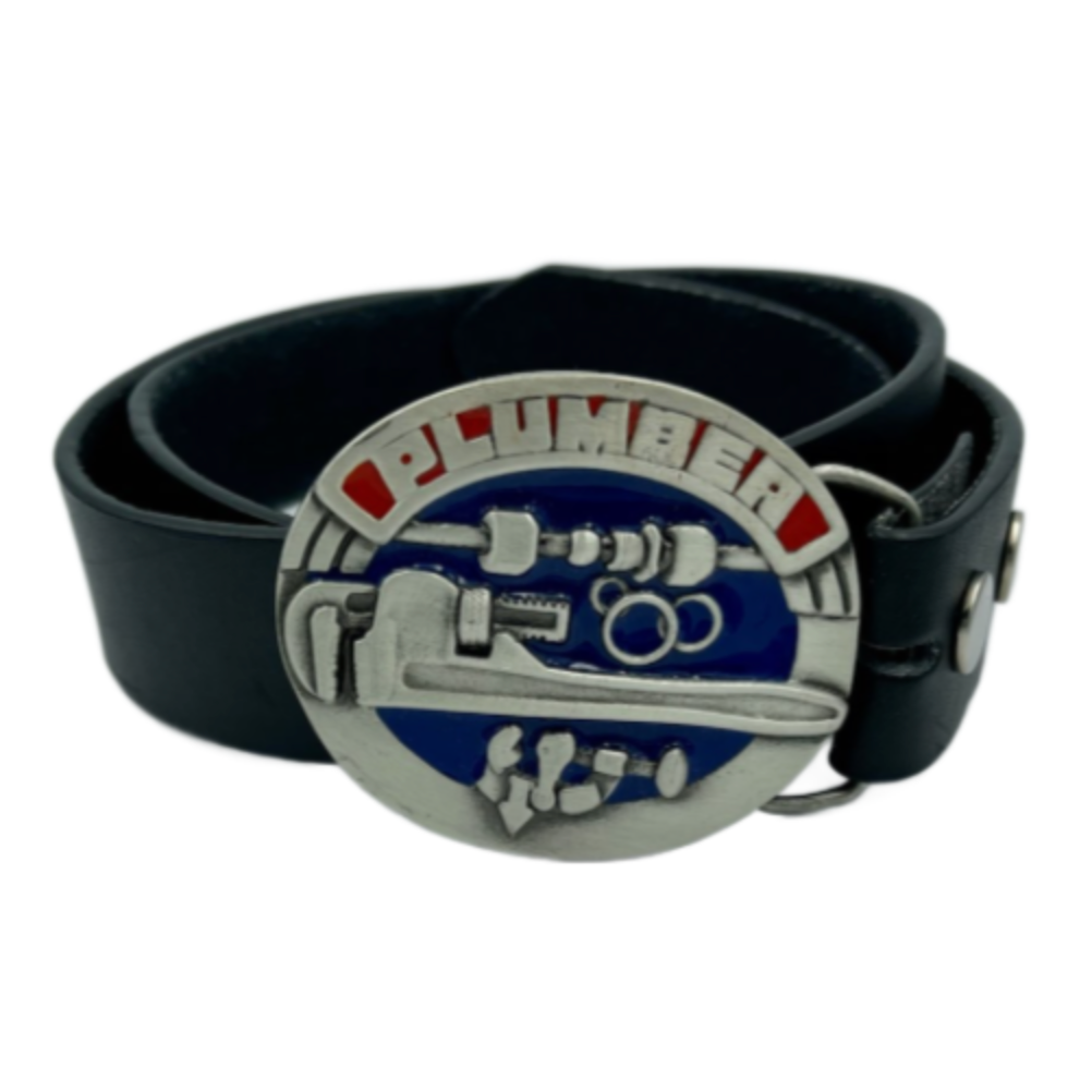 This Plumber Belt Buckle fits a belt strap up to 1.75 inches (metric 4.5 cm) in width.