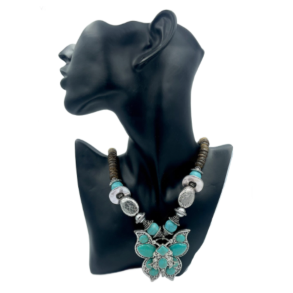Turquoise Colored Stone Butterfly And Wood Beaded Necklace Fashion Jewelry