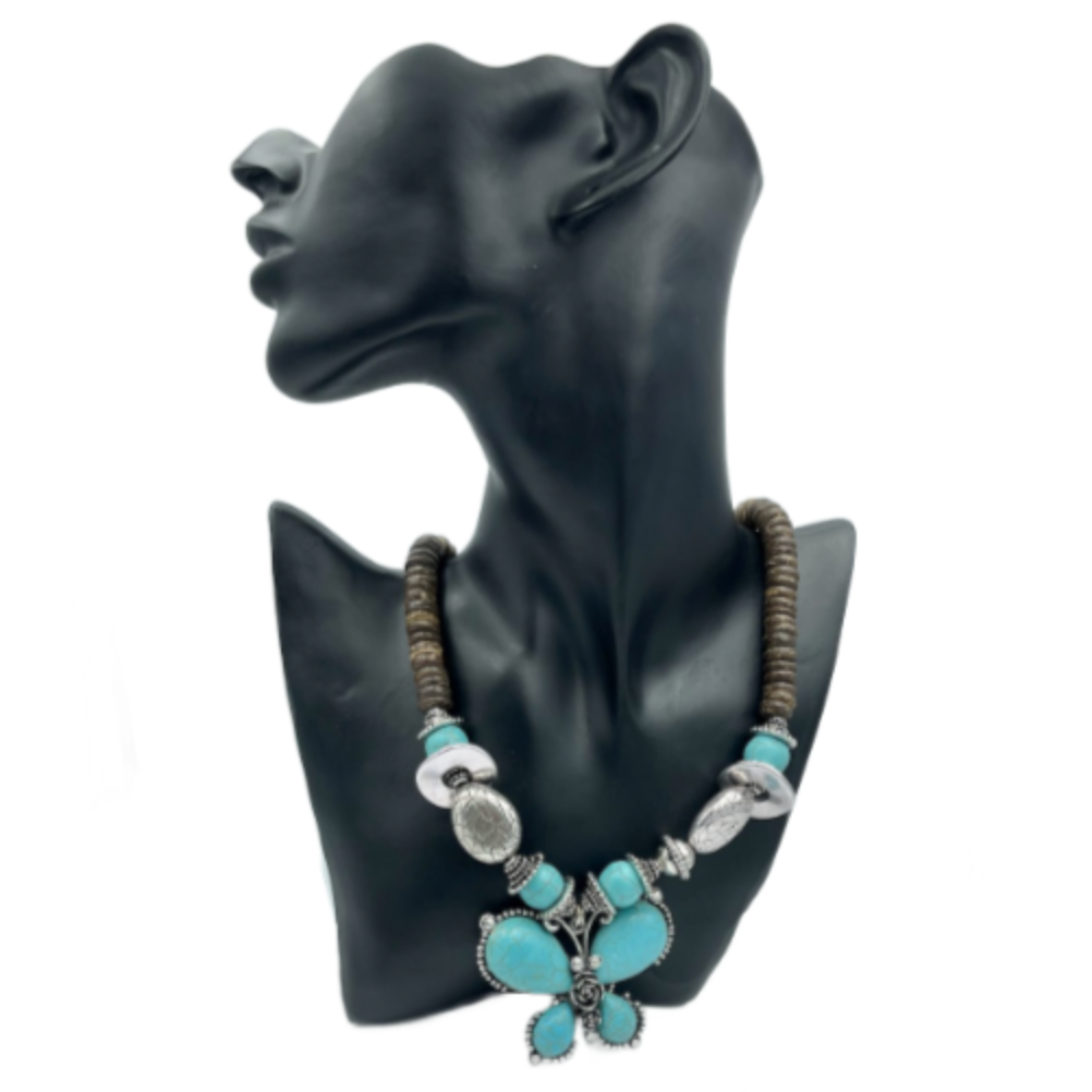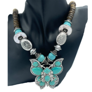 Turquoise Colored Stone Butterfly Wood Beaded Necklace Fashion Jewelry